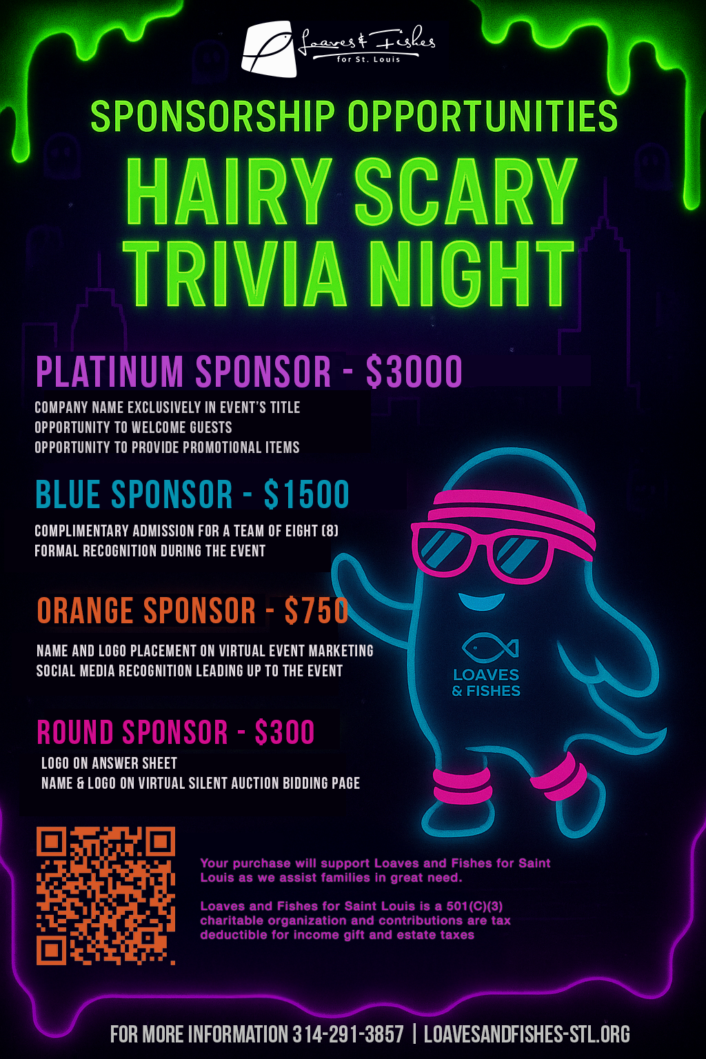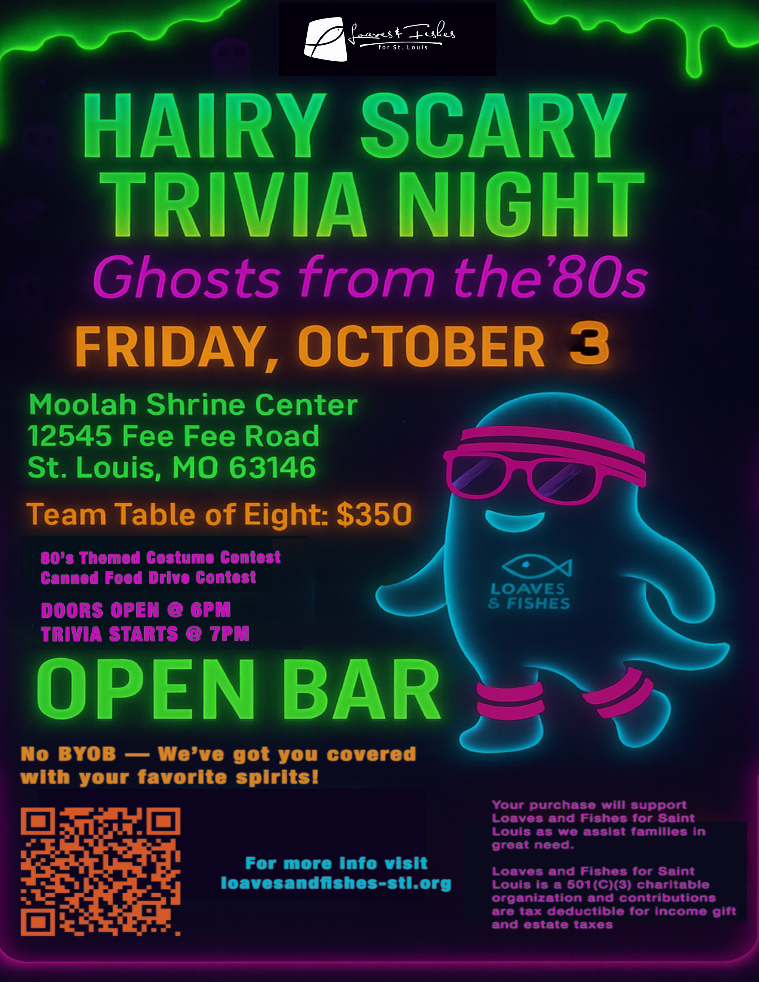 Get ready for a frightfully fun evening of costumes, cocktails, and clever questions at Hairy Scary Trivia Night 2025! This spooktacular event supports the high-impact programs of Loaves and Fishes for St. Louis, including Emergency Housing, Food Pantry services, Prevention Services, and Outreach efforts. Best of all, 100% of funds raised stay right here in St. Louis County to help our neighbors in need.